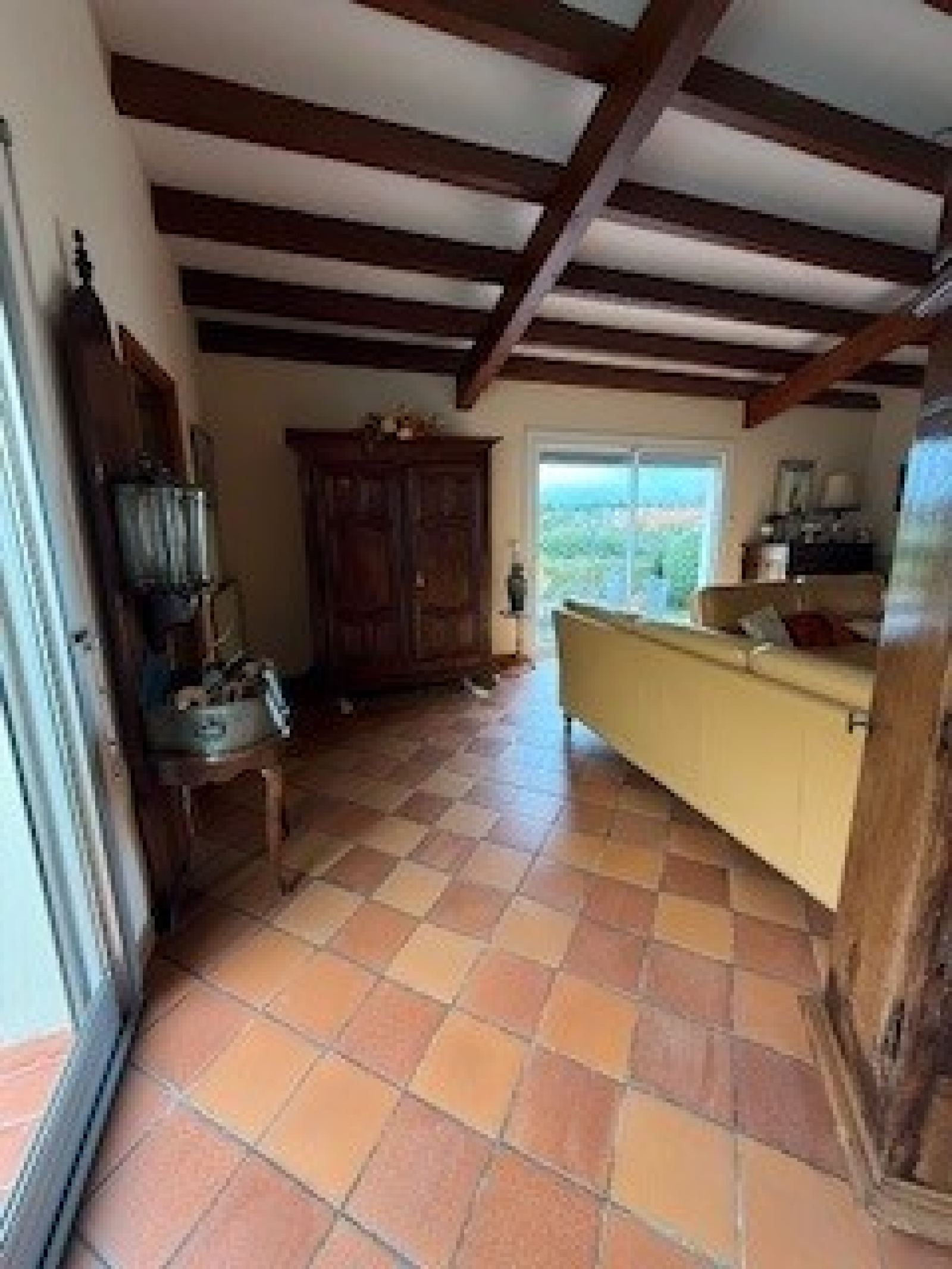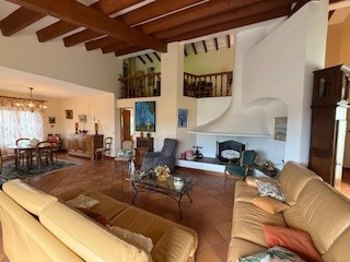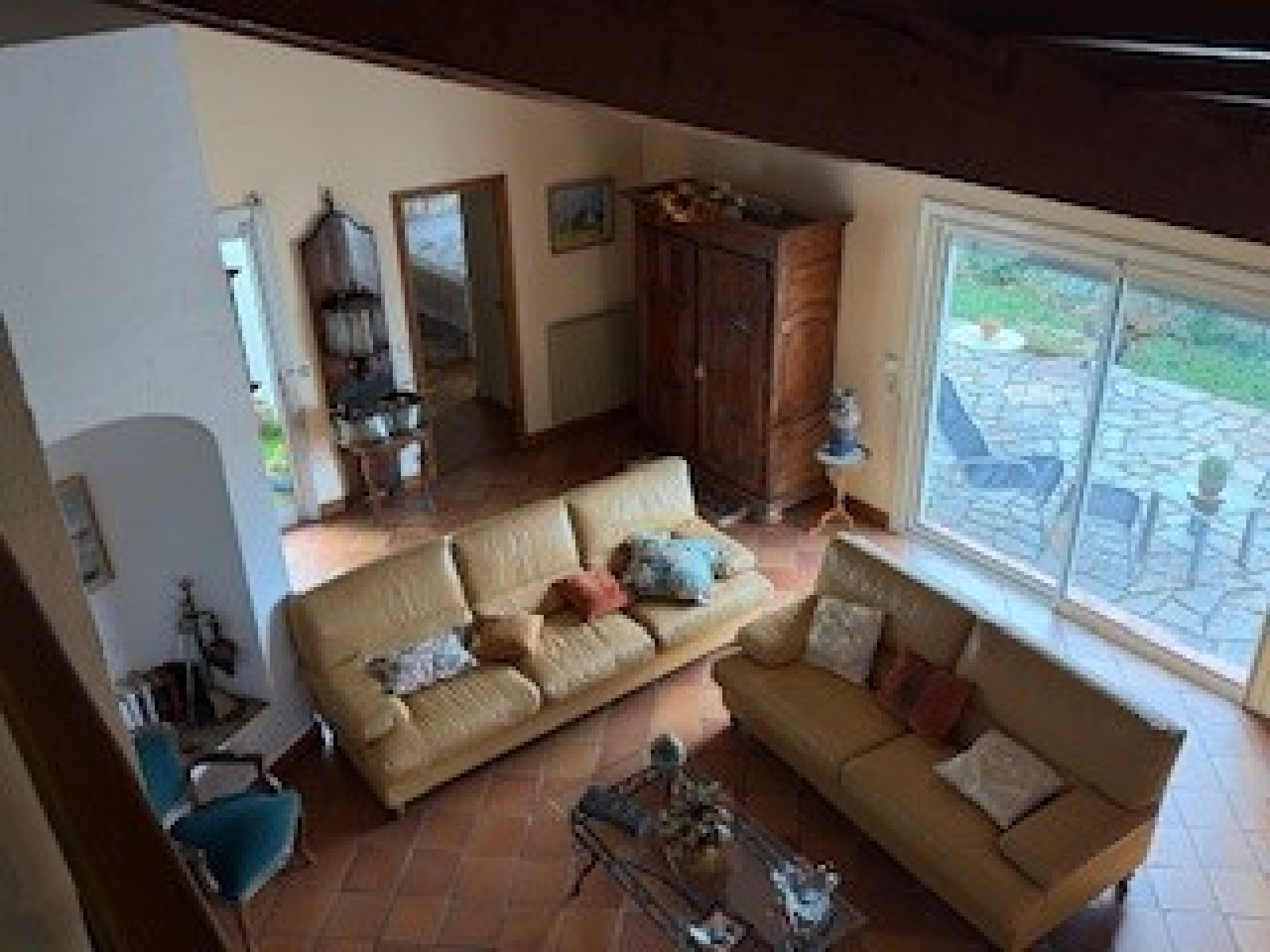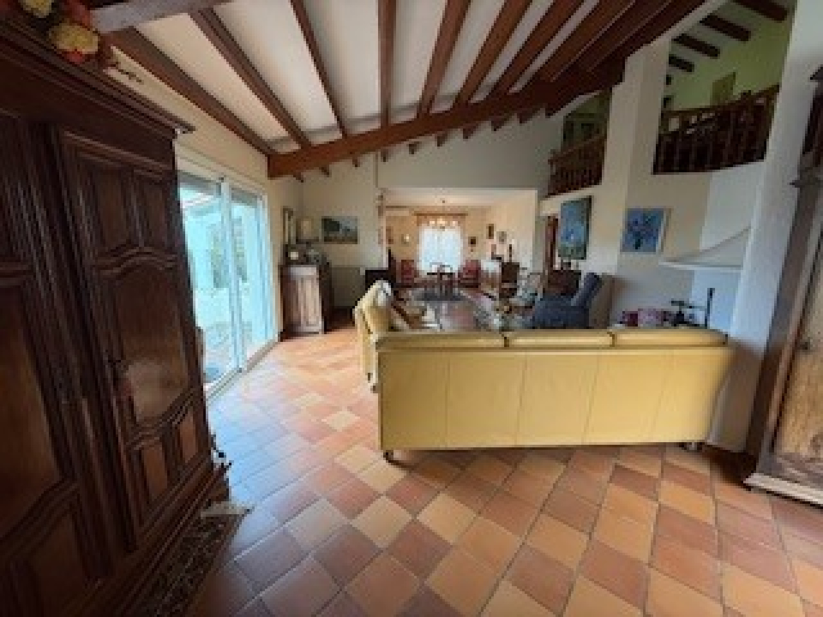 L'espace jour comprend: un grand salon/séjour avec cheminée et accès aux deux terrasses (dont une est couverte), une cuisine séparée, meublée et semi-équipée, avec accès au garage et à la buanderie.